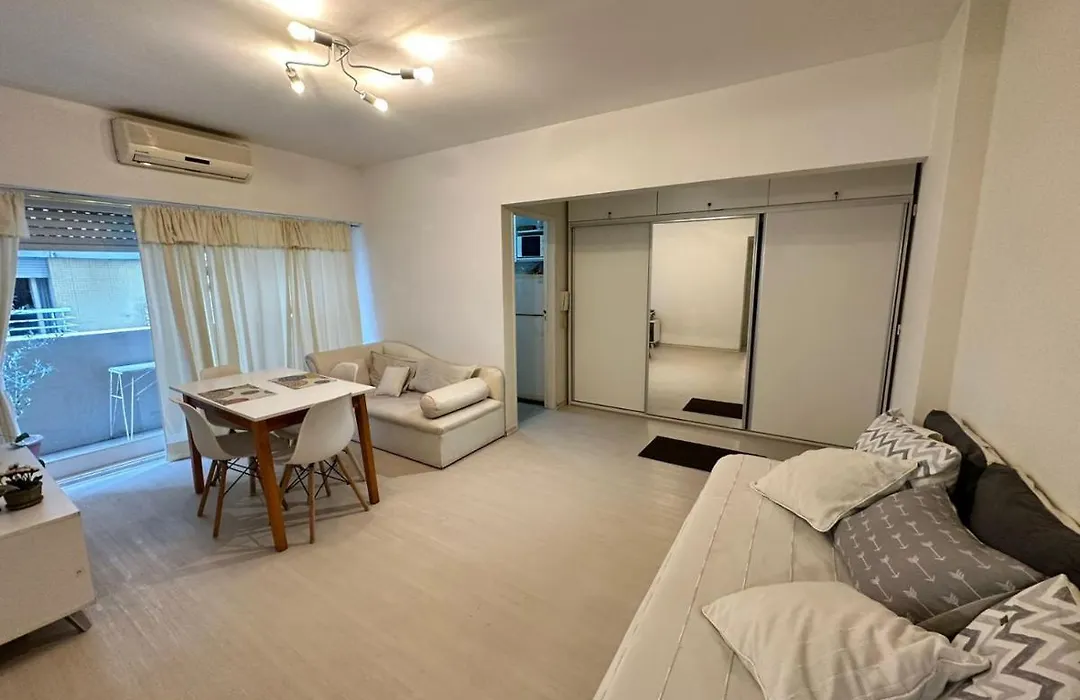 Este apartamento cuenta con un balcón y una zona de estar, y comodidades como climatizador. Disfruta de la comodidad del baño del Apartamento Depto A Metros De Av 9 De Julio, equipado con toallas.